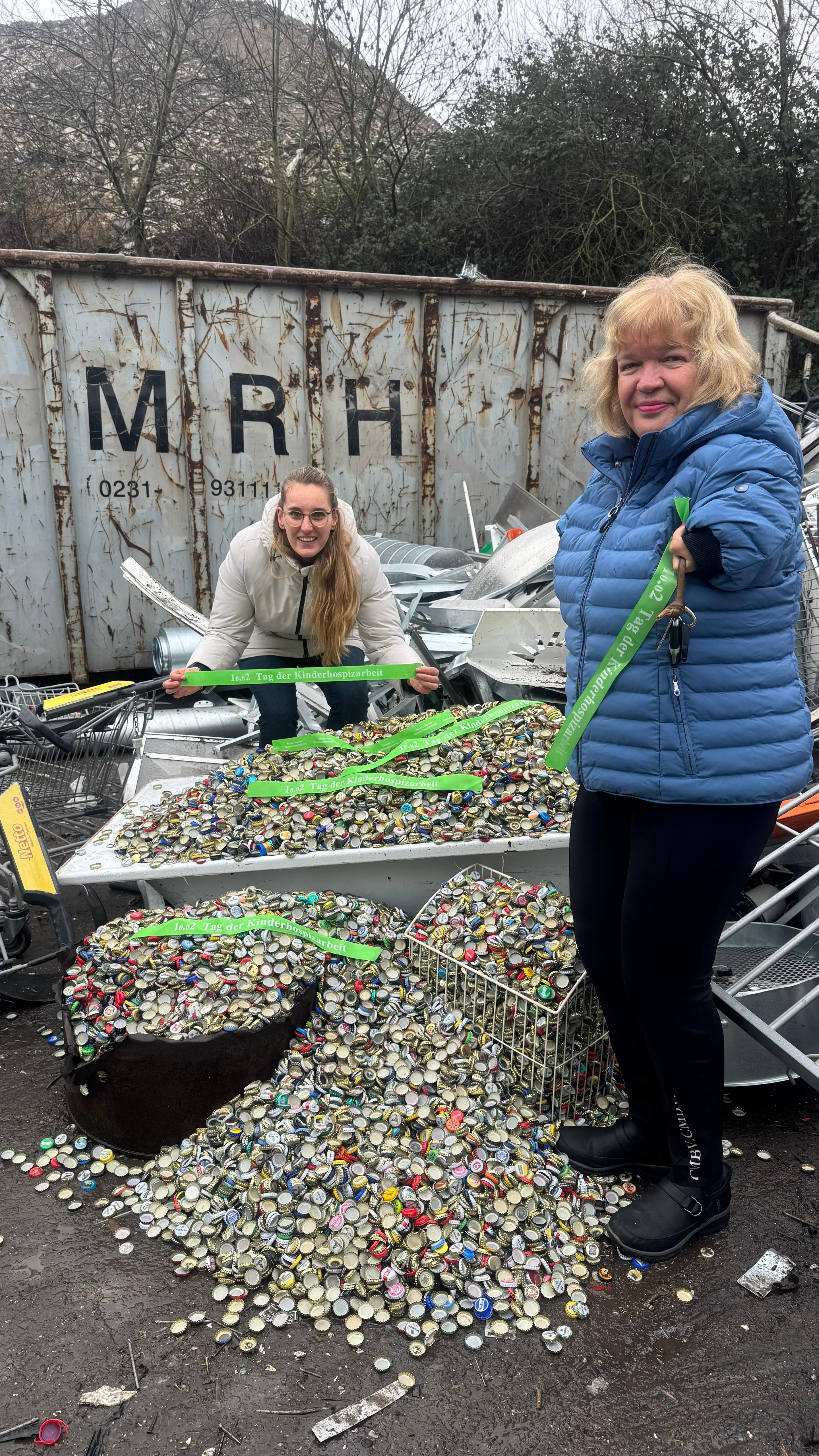 Ein Bestandteil der Aktion war das Sammeln von Kronkorken. Über einen längeren Zeitraum wurden an der Schule Kronkorken gesammelt, die schließlich ein Gesamtgewicht von 220 Kilogramm (!) erreichten. Lehrerin Christina Reich-Ruhnau brachte diese stolze Summe gemeinsam mit Bärbel Drohmann, ehrenamtliche Helferin vom AKHD) zum Wertstoffhof. Der Recycling-Erlös ist für den guten Zweck gedacht.