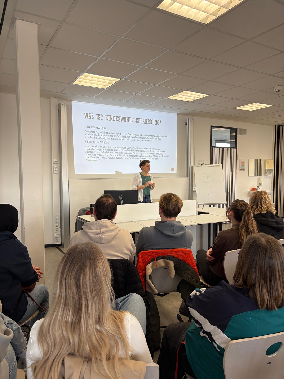 Der Vormittag war dem Schwerpunkt Kinderschutz und Kindeswohlgefährdung gewidmet. Kerstin Balitzki, Sozialberaterin und Case Managerin, informierte die Schüler über gesetzliche Grundlagen, Verfahrensabläufe im Kinderschutz sowie Möglichkeiten und Grenzen der Inobhutnahme. Darüber hinaus stellte sie konkrete Ansprechpartner für den Meldefall vor und erläuterte Indikatoren sowie Risikobereiche, die auf eine mögliche Kindeswohlgefährdung hindeuten können. Anhand anschaulicher Beispiele – unter anderem aus der Praxis des Jugendamts Lünen – wurden die theoretischen Inhalte greifbar vermittelt.