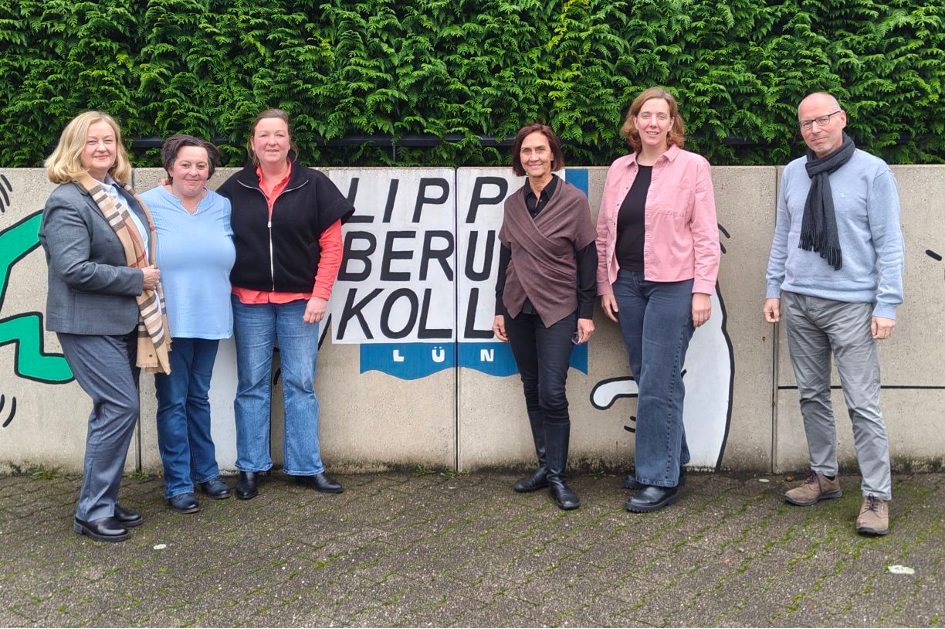 Irina Funke (vif), Jennifer Matschek (Multikulturelles Forum), Katja Arens (KIM Kreis Unna), Uta Siewecke, Carmen Uibel (beide Lippe Berufskolleg) und Marcus Heer (Multikulturelles Forum) freuen sich gemeinsam auf das neue Unterstützungsangebot für Auszubildende am Lippe Berufskolleg Lünen. Foto: LBK