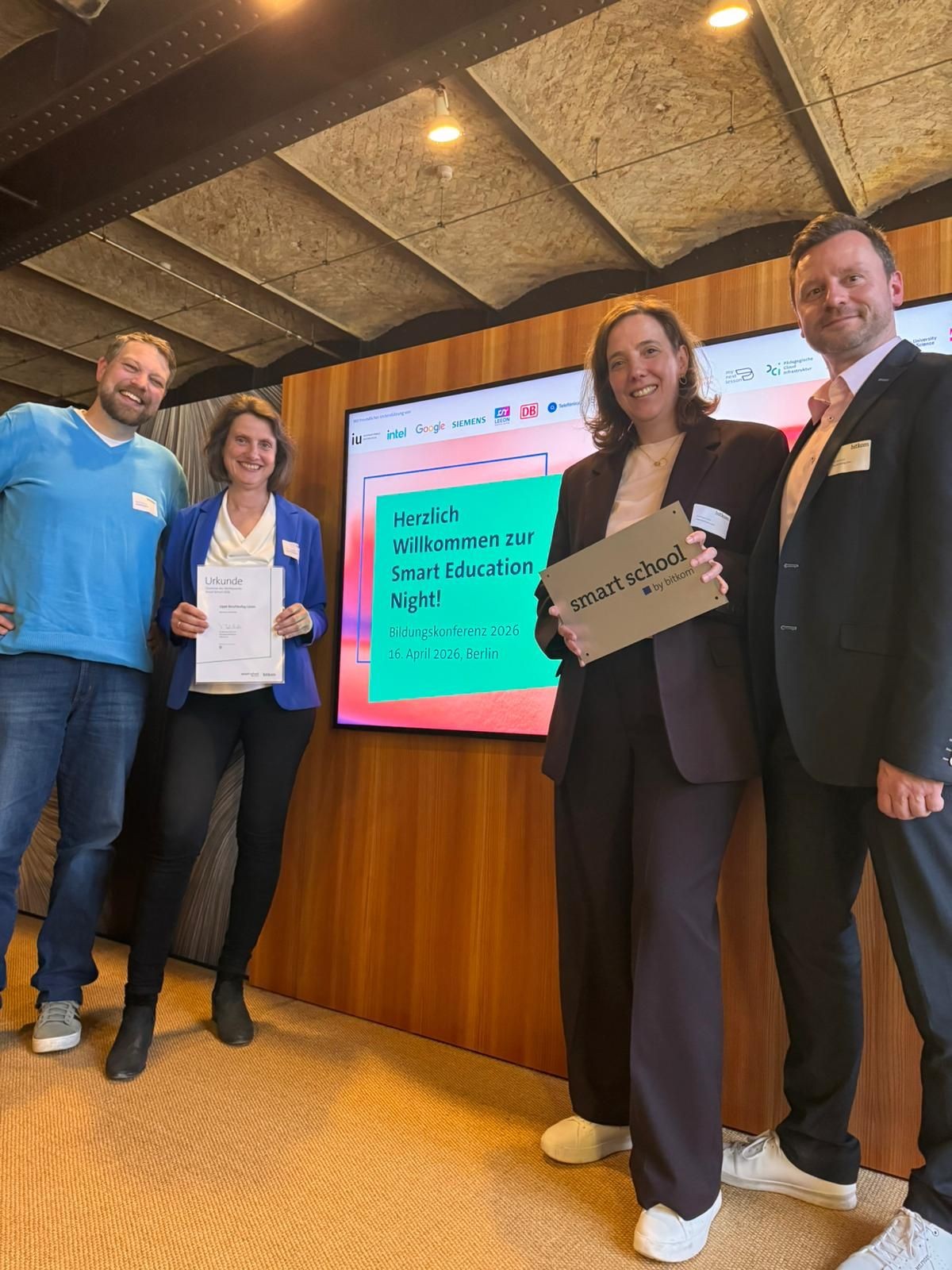 Bildzeile: Andrea Krollmann und Rita Vonnahme (v.l.) freuten sich über die Auszeichnung "Verbraucherschule Gold", die von Bundesverbraucherschutzministerin Dr. Stefanie Hubig (2.v.r.) sowie von Ramona Pop, Vorständin des verbraucherzentrale Bundesverbandes, vorgenommen wurden. Foto: LBK